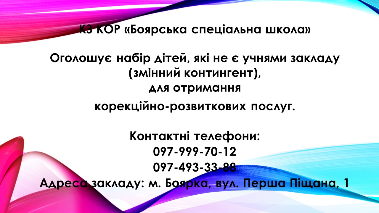 Для отримання детальної інформації та консультацій щодо платних освітніх послуг, будь ласка, звертайтеся до адміністрації КЗ КОР “Боярська спеціальна школа”.